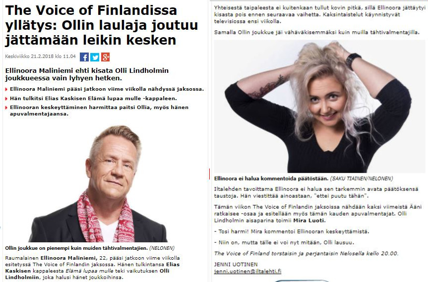 Itse asiassa aavistelin jo ennen keskeyttämistietoa, että Ellinoora ei ole mukana liveissä. "Ellinoora Maliniemi kertoo, ettei The Voice of Finland ole vaikuttanut hänen musiikkiharrastukseensa." https://ls24.fi/raumalainen/ellinoora-toteutti-sen-mista-haaveili-lapsena-esiintyy-tvofissa-helmikuussa